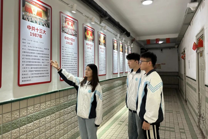 为进一步提升政治理论素养,深刻领悟党的历程,增强对党的历史认同感与历史使命感,文化创意产业学院组织入党积极分子于2025年09月23日在“一站式”学生社区文化长廊开展党史学习主题参观活动。本次活动由入党积极分子代表唐春宇带领讲解。